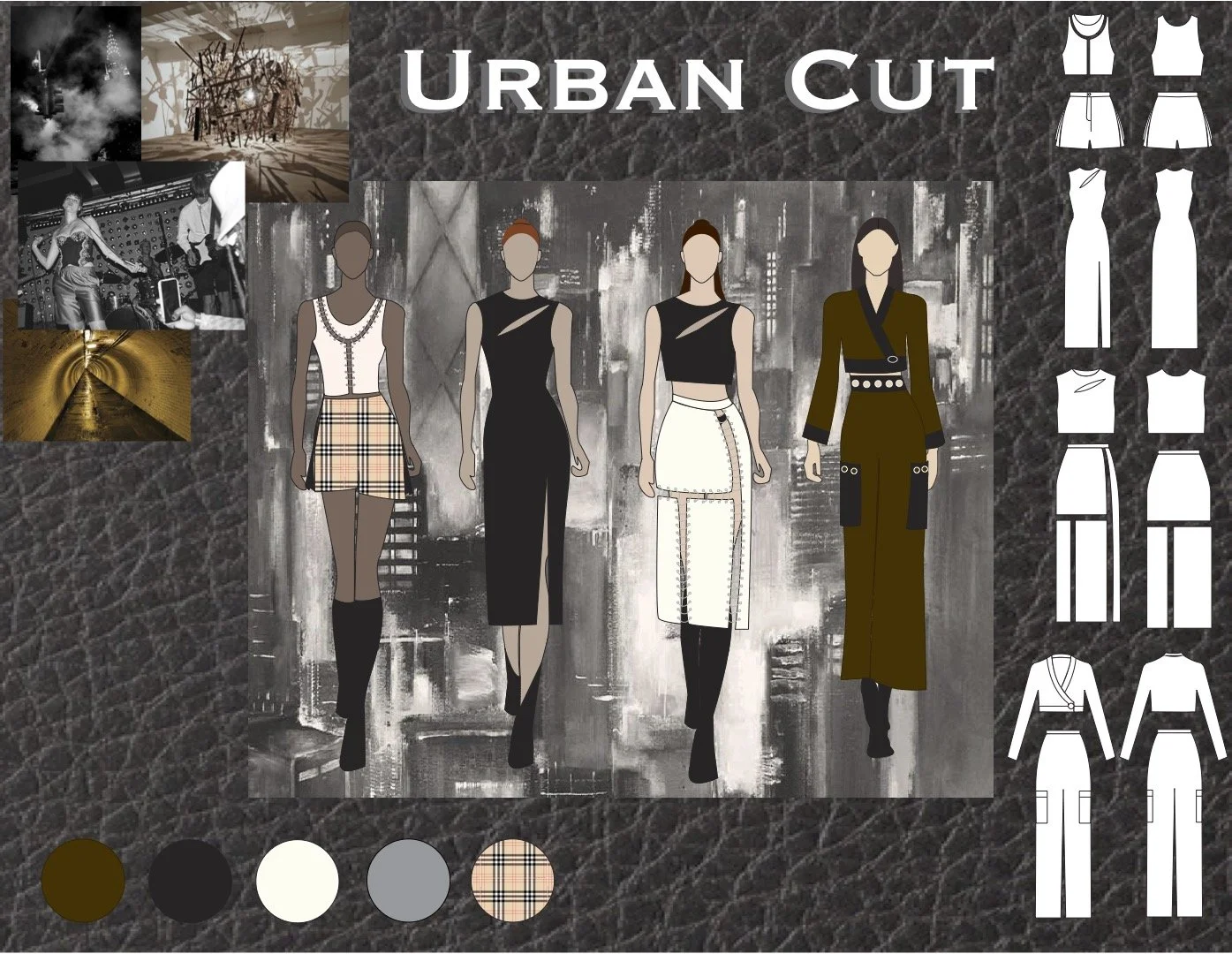 Inspired by dark rock music and the panic of city life. The deep slashes portray violence and the vulnerability one can feel in such a densely populated scene. The leather acts as armour for this very reason. Metal accents mirror the aforementioned feelings of fear and vulnerability, but the linking of each garment section signifies maintaining strength while falling apart. With a strong emphasis on the cold exterior of NYC and the healing power of music, this collection explores vulnerability and strength in new experiences.